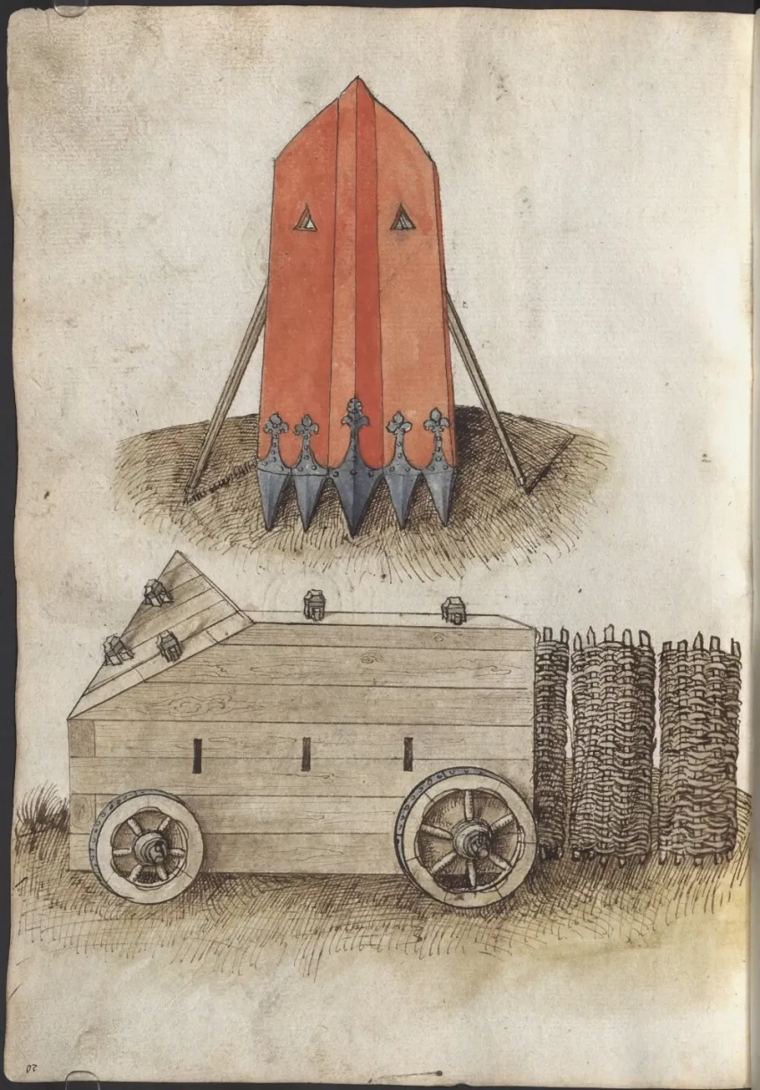 Проект «дешевых укреплений» для замка. Обычная земля, бревна и колья из леса вполне, по мнению Мартина Мерца, могли послужить для создания оборонительных сооружений там, где они отсутствовали. «Книга фейерверков». Мартин Мерц. Северная Бавария/Франкония, I: 2-я половина XV века; 1473 г. Баварская государственная библиотека, Мюнхен