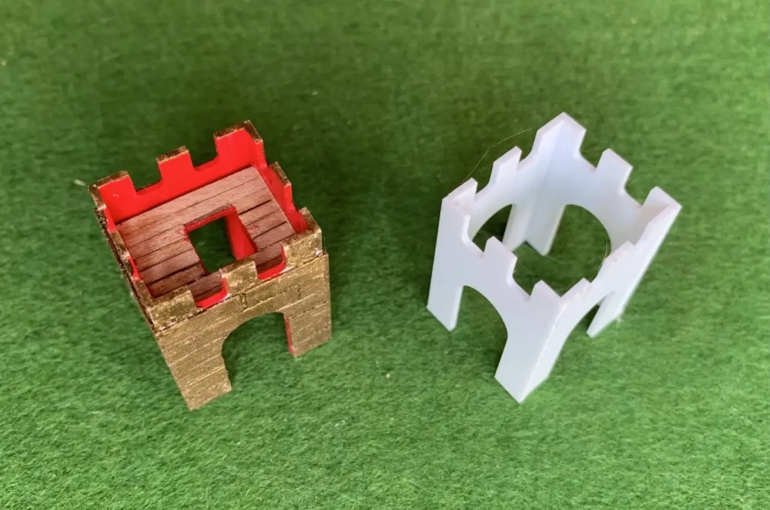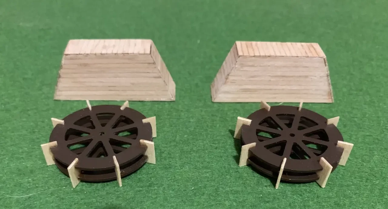 Детали боевых башен, так же как и гребные колеса, вырезаны из полистирола толщиной 1 мм на стенке с ЧПУ. Однако их совсем нетрудно вырезать и из тонкого картона, вплоть до поздравительных открыток и упаковок из-под чая! На готовых башнях полосками шпона имитируют бронзовые листы…