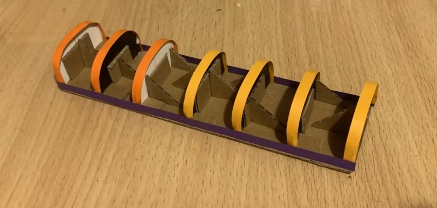Изображённая на нашем фото деталь может быть сделана из чего угодно, включая упаковочный картон и нарезанные полоски плотной бумаги. Снаружи остов оклеивается палочками-мешалками для кофе в два ряда с использованием клея ПВА. Затем все внутренние крепления кроме концевых переборок удаляются, после чего корпус изнутри оклеивается полосками шпона шириной 2 мм.