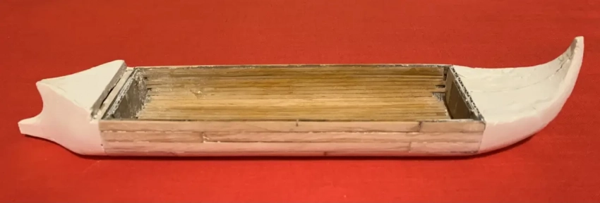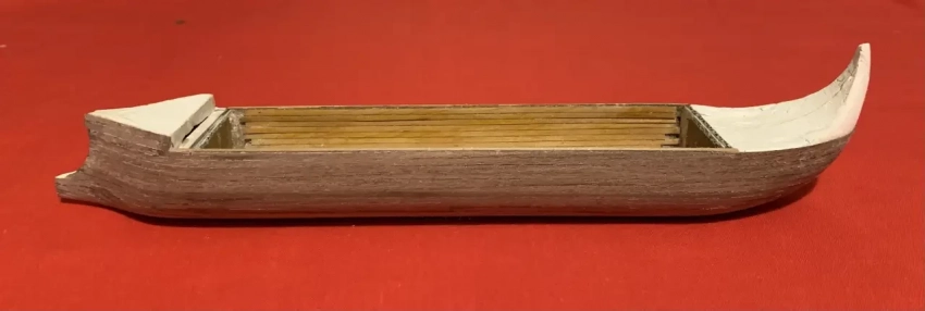 Средняя часть корпуса с оконечностями из самополимеризующейся глины. Хорошо видна внутренняя обшивка корпуса