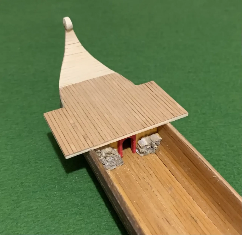 Сами стойки под модель – картонные конусы, вырезанные из упаковки для яиц, залитые эпоксидной смолой и раскрашенные под бронзу. Вёсла – китайские зубочистки. Перила – склеены из реек 2х2 мм. Красивые завитки на носовом фальшборте вырезаны из полистиролового веера, так же как и детали новогодней кареты, о которой здесь уже как-то рассказывалось. Глаза на носу нарисовать от руки представляется делом совершенно невозможным. Но их можно заказать в типографии, где делают термонаклейки, и перевести на место при помощи паяльника, поставленного на самый малый нагрев.