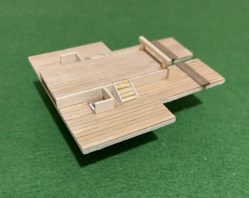 Вид сверху. Подставка – кусок ДСП, оклеенный полосками шпона. Палубный настил покрыт лаком. Перила и части корпуса – акриловая краска красного и синего цвета