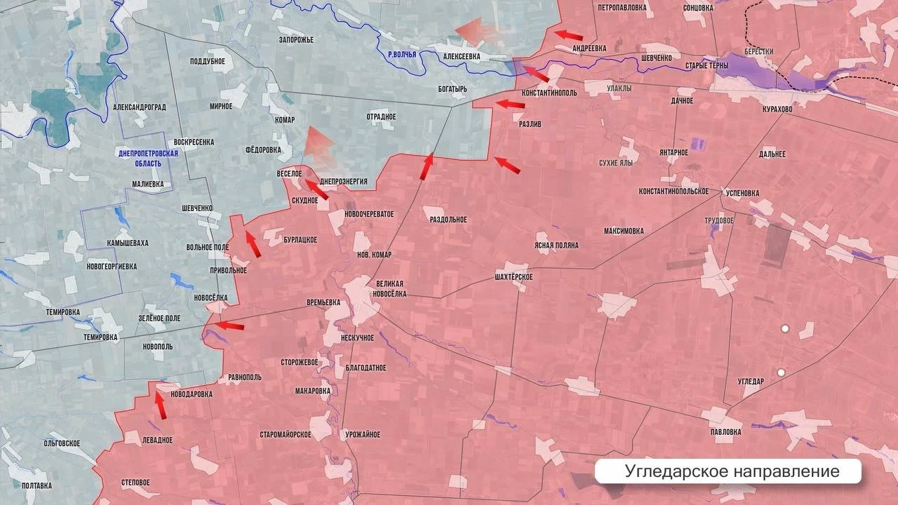 На Угледарском направлении упорные бои в Вольном Поле и Весёлом. В районе Богатыря и Отрадного наши штурмовики продолжают планомерно продавливать оборону ВСУ при поддержке авиации и артиллерии. На окраинах Алексеевки интенсивные встречные бои.