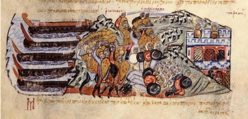 Маниак высаживается в Сицилии. Миниатюра. Иоанн Скилица. «История византийских императоров». Мадридский список. XIII в. Национальная библиотека. Мадрид