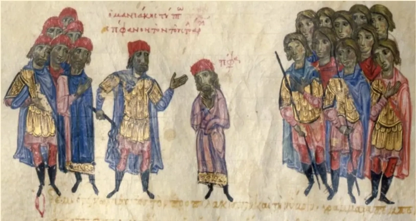 Маниак ругается со Стефаном Калафатом. Миниатюра. Иоанн Скилица. «История византийских императоров». Мадридский список. XIII в. Национальная библиотека. Мадрид