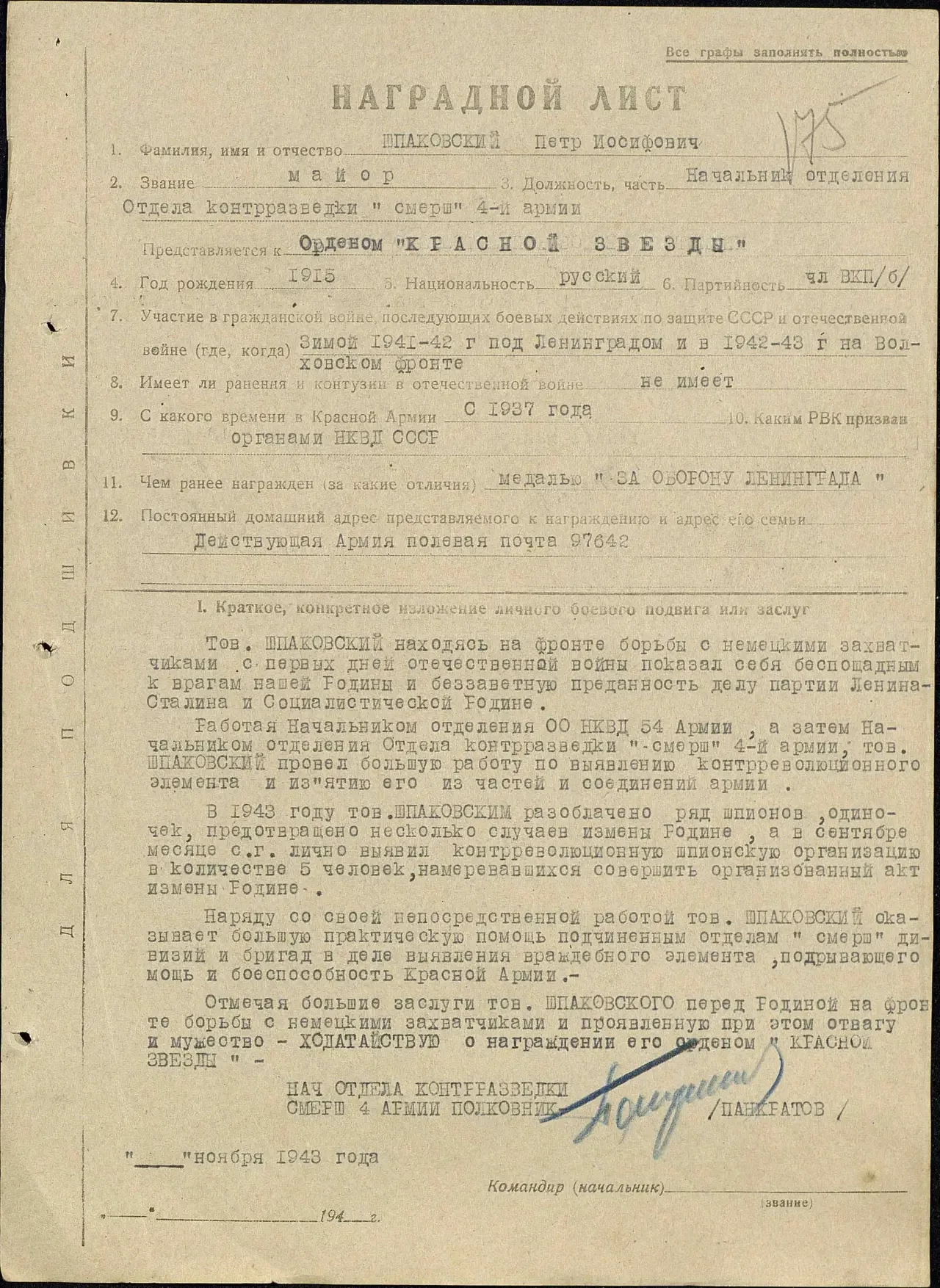 Так что всё, о чём здесь в дальнейшем будет написано, это не что иное, как пересказ рассказов Петра Шпаковского. Насколько каждый из них был достоверен, я, разумеется, сказать не могу. Это был его взгляд на события той войны и своё в них участие. О чём-то было рассказано очень подробно. О чём-то упомянуто вскользь. Так что я сразу же хочу предупредить читателей ВО, что это не задокументированная хроника, а пересказ пересказа, самых интересных моментов из жизни офицера СМЕРШ («Смерть шпионам»). Хотя отдельные документы сегодня и имеются. Например, наградной лист, датированный ноябрём 1943 года, о представлении Петра Шпаковского к награждению орденом «Красной звезды».