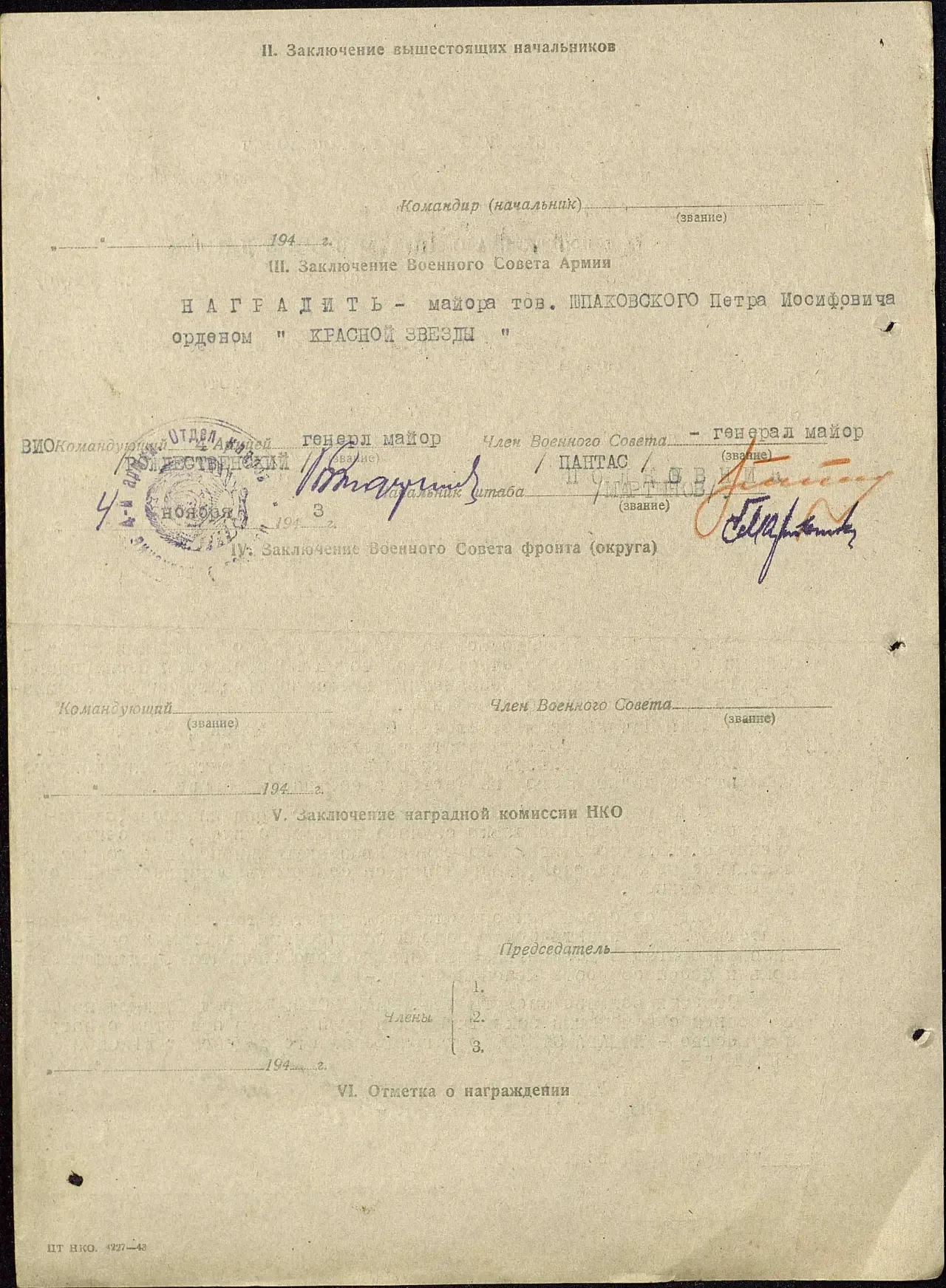 Отмечая большие заслуги тов. ШПАКОВСКОГО перед Родиной на фронте борьбы с немецкими захватчиками и проявленную при этом отвагу и мужество – ХОДАТАЙСТВУЮ о награждении его орденом «КРАСНОЙ ЗВЕЗДЫ».