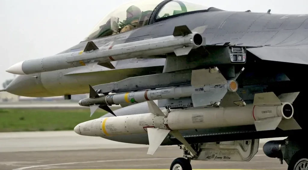 Самолёт F-16C ВВС США несёт на законцовке крыла ракету AIM-120C AMRAAM, на крайнем подкрыльевом пилоне — ракету AIM-9L/M Sidewinder, а на среднем подкрыльевом пилоне — ракету AGM-88 HARM. ВВС США