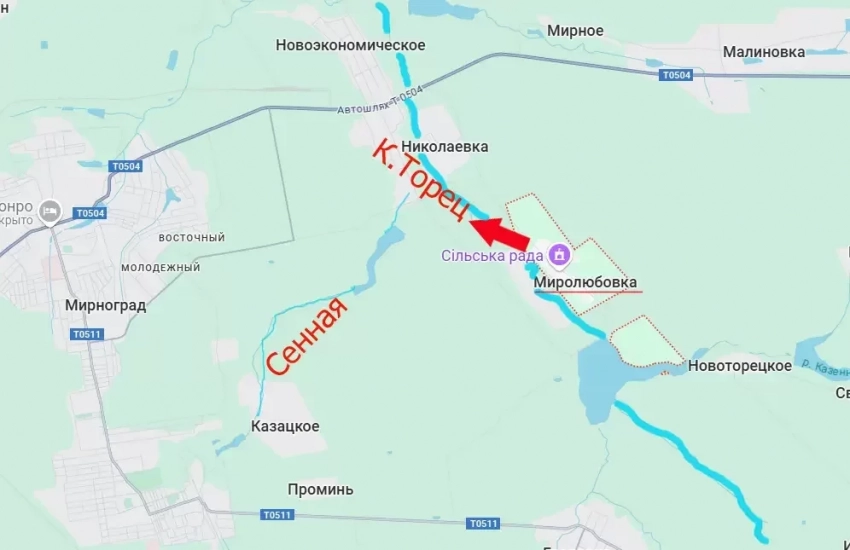 А выход западнее Казённого Торца создаёт усиливающееся давление на восточные окраины Мирнограда, лишая ВСУ возможности использовать реку в качестве естественной преграды. На пути у ВС РФ есть ещё река Сенная, но, во-первых, она является притоком Казённого Торца и потому существенно меньше него, во-вторых, у армии России есть позиции и южнее Сенной – со стороны ранее освобождённых Гродовки и Николаевки.