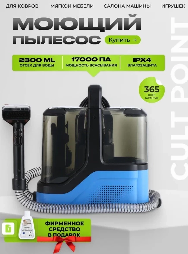 Моющий пылесос Cult Point — практичное и мощное решение для дома, где важна не просто чистота, а гигиеничность. С аквафильтром и функцией сбора жидкостей он справляется с загрязнениями на мебели, коврах и твёрдых покрытиях. Мощность всасывания 600 Вт в сочетании с тихой работой (всего 70 дБ) делает его отличным выбором для регулярного использования. Наличие функции самоочистки упрощает уход за устройством. В рейтинге моющих пылесосов для мебели и ковров модель Cult Point уверенно занимает своё место как удобный и эффективный помощник.