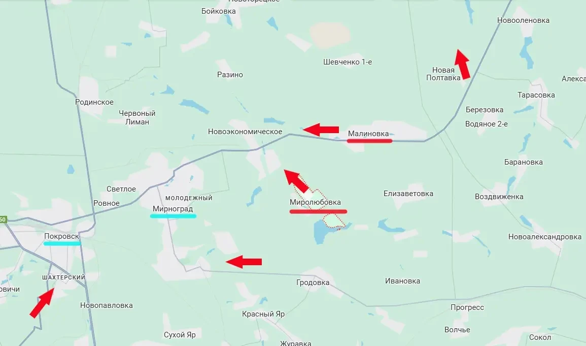 ВСУ потеряли территории в районе Новой Полтавки к северо-востоку от Покровска (Красноармейска), Новосергеевки (у границы с Днепропетровской областью). Также наши войска продвигаются в сторону Новоэкономического – пригорода Мирнограда. Продвижение идёт как с юга, со стороны ранее освобождённой Миролюбовки, так и с востока – от Малиновки, которая так же освобождена армией России.
