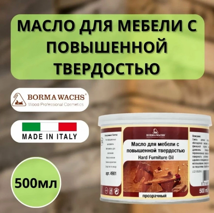 Hard Furniture Oil от Borma Wachs — твёрдое масло для внутренней отделки мебели и деревянных элементов, уверенно занявшее место в подборке масло для мебели рейтинг. Благодаря армированной формуле из льняного масла, карнаубского и пчелиного воска, оно эффективно защищает дерево от влаги и механических повреждений, придавая покрытию благородную матовую глубину. Особенно хорошо проявляет себя на пористых породах древесины, а простота нанесения делает его идеальным решением даже для непрофессионального ухода.