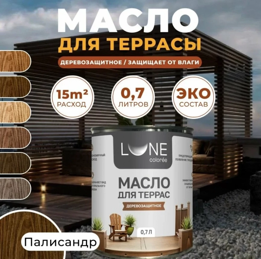 Масло для террас LUNE COLOREE на основе тунгового и льняного масел — это надежная защита и выразительный внешний вид для любых деревянных поверхностей. Оно глубоко проникает в структуру дерева, эффективно противостоит влаге, ультрафиолету и износу, сохраняя натуральную текстуру. Благодаря добавлению растительного воска формируется прочное, водоотталкивающее и стойкое к растрескиванию покрытие. Это идеальное решение для террас, садовой мебели, фасадов и даже интерьера.