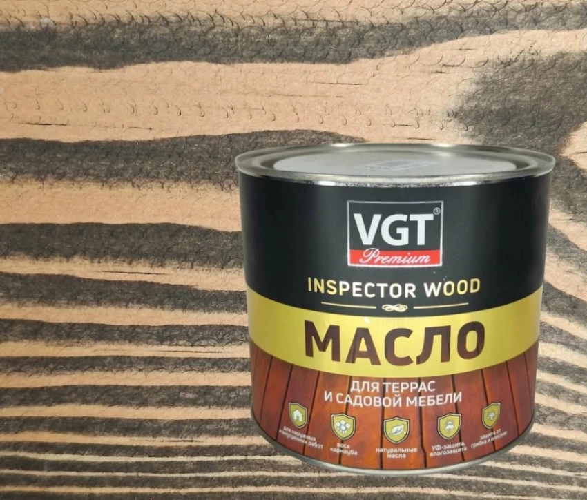 Масло для террас и садовой мебели VGT Premium Inspector Wood — практичное решение для защиты уличной древесины: беседок, террас, садовых столов и лавок. В составе — льняное, тунговое и касторовое масла, усиленные воском и УФ-фильтрами, благодаря чему покрытие не отслаивается, глубоко проникает в структуру дерева и эффективно отталкивает воду, грязь и плесень. Не образует плёнку, подчёркивает текстуру и сохраняет естественный цвет древесины — недаром входит в популярный масло для мебели рейтинг.