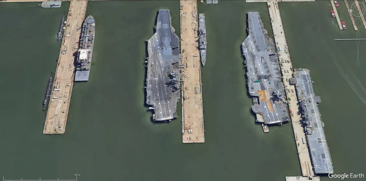 Спутниковый снимок Google Earth: авианосцы USS Harry S. Truman (CVN-75) и USS George HW Bush (CVN-77) на судоремонтном предприятии Norfolk Naval Shipyard