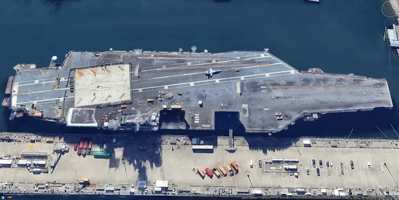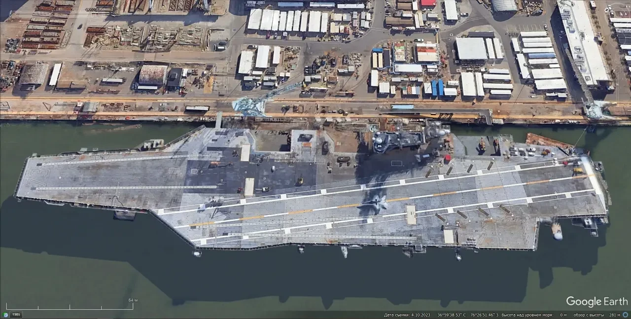 Спутниковый снимок Google Earth: авианосец USS George Washington (CVN-73) на верфи Newport News Shipbuilding. Снимок сделан в апреле 2023 года