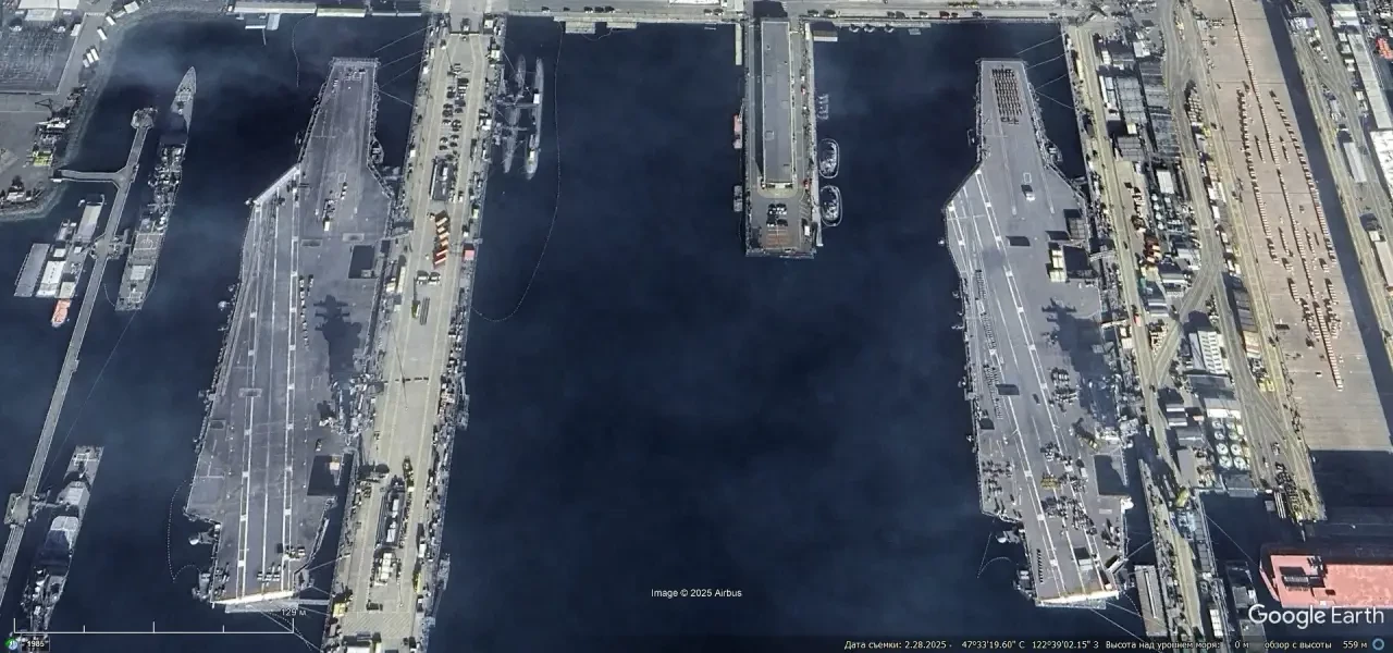 Спутниковый снимок Google Earth: авианосцы «Нимиц» и «Рональд Рейган» на стоянке военно-морской базы Китсап, снимок сделан в феврале 2025 года
