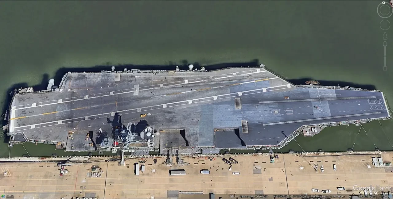 Спутниковый снимок Google Earth: авианосец USS Dwight D. Eisenhower (CVN-69) на стоянке в Норфолке. Снимок сделан в апреле 2023 года
