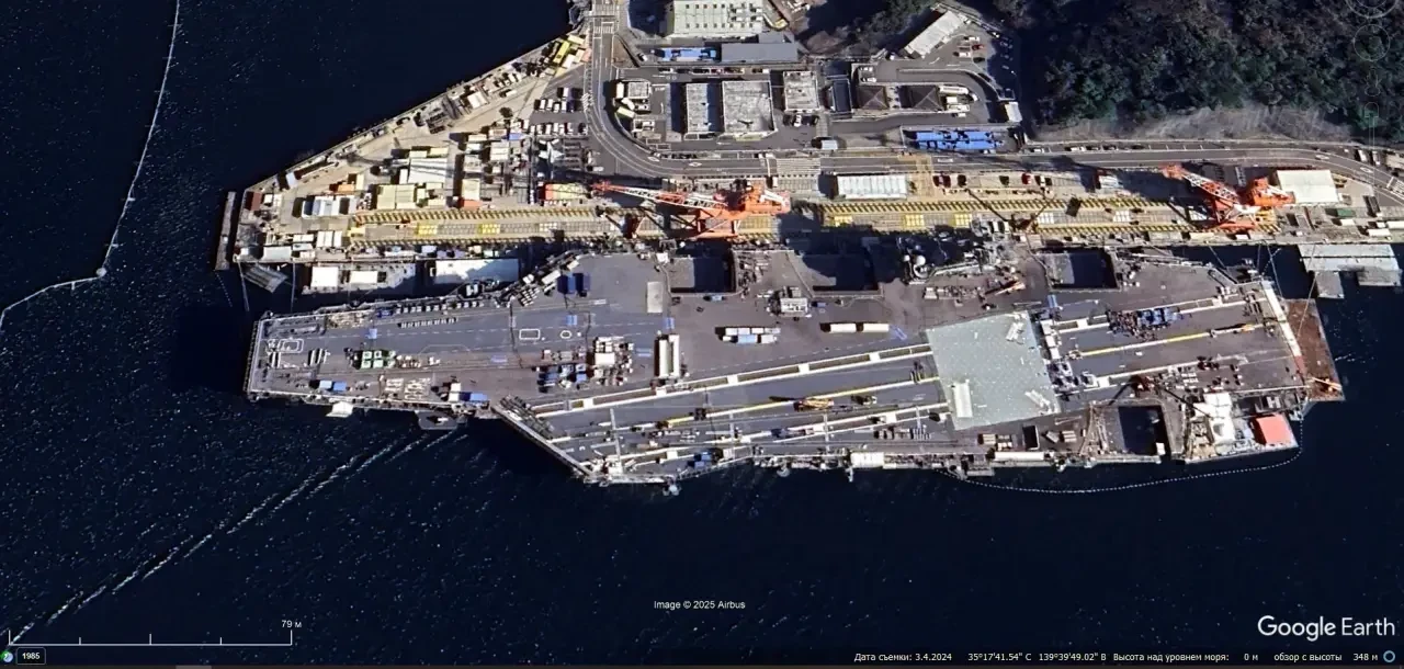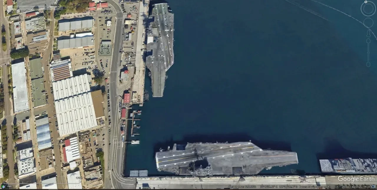 Спутниковый снимок Google Earth: авианосец USS Ronald Reagan (CVN-76) на стоянке в японском порту Йокосука. Снимок сделан в марте 2024 года