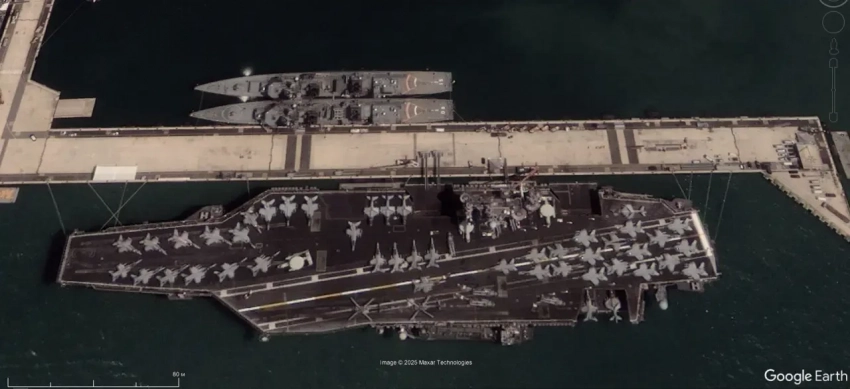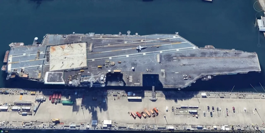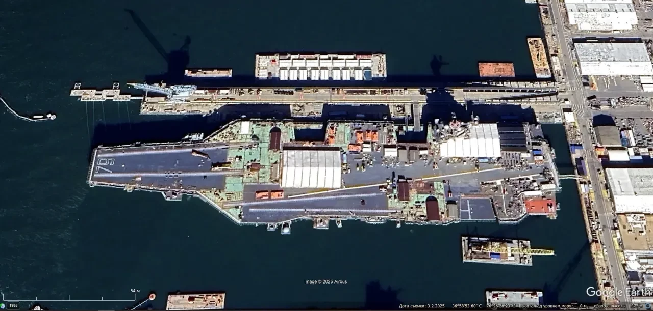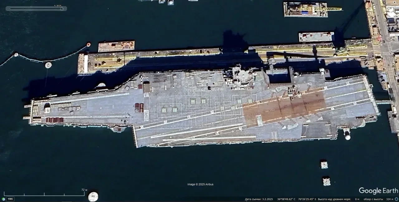 Спутниковый снимок Google Earth: авианосец USS John F. Kennedy (CVN-79) на верфи Newport News Shipbuilding. Снимок сделан в марте 2025 года