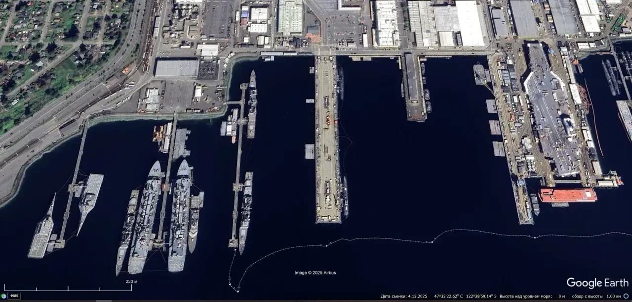 Спутниковый снимок Google Earth: часть причальных сооружений и сухой док с авианосцем типа «Нимиц» на верфи Puget Sound Naval Shipyard