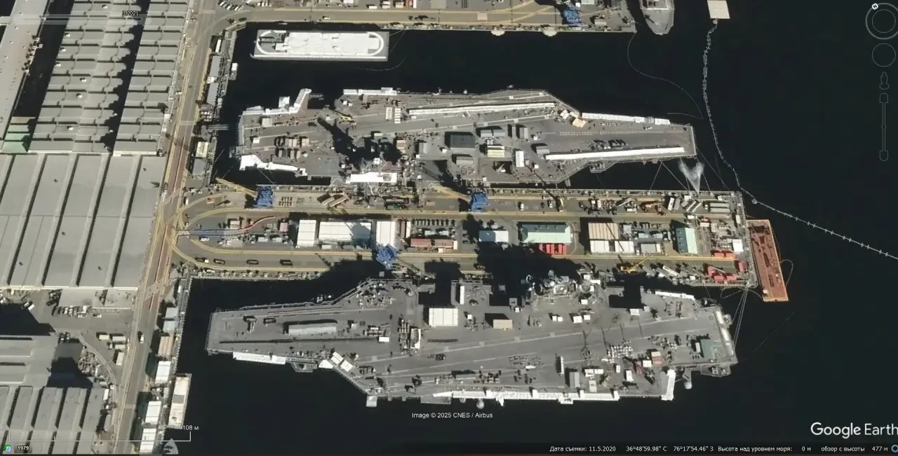 Спутниковый снимок Google Earth: авианосец USS Enterprise (CVN-65) на верфи Newport News Shipbuilding. Снимок сделан в марте 2025 года