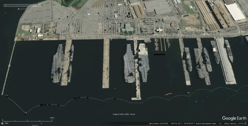 Спутниковый снимок Google Earth: стоянка авианосцев в Норфолке