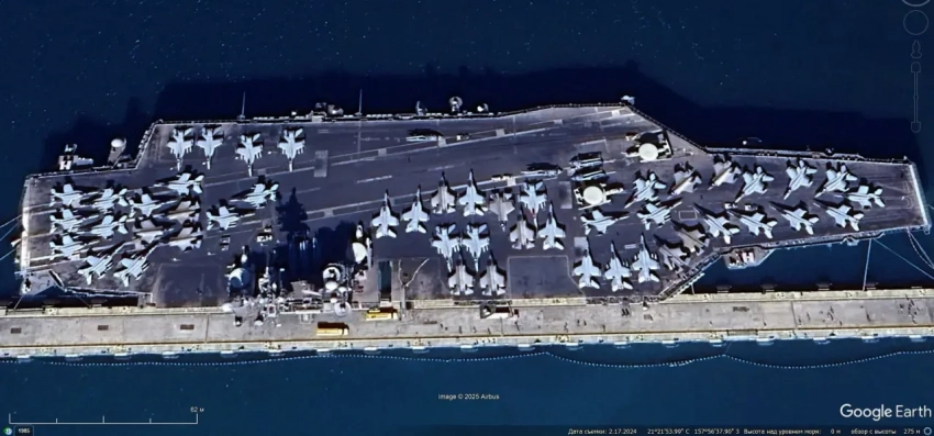 Спутниковый снимок Google Earth: авианосец USS Carl Vinson (CVN-70) на стоянке военно-морской базы Перл-Харбор. Снимок сделан в феврале 2024 года