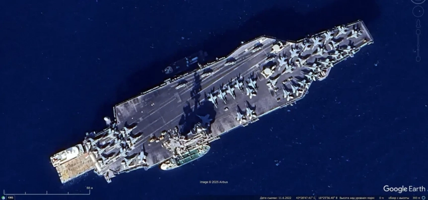 Спутниковый снимок Google Earth: авианосец USS George H. W. Bush (CVN-77) в акватории хорватского порта Сплит. Снимок сделан в ноябре 2022 года