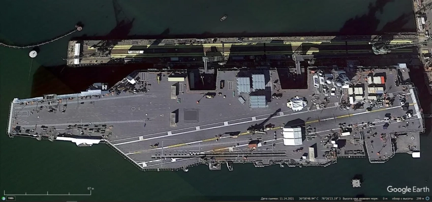 Спутниковый снимок Google Earth: авианосец USS Gerald R. Ford (CVN-78) на верфи Newport News Shipbuilding. Снимок сделан в ноябре 2021 года
