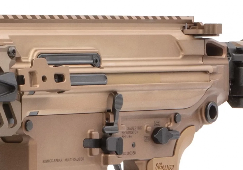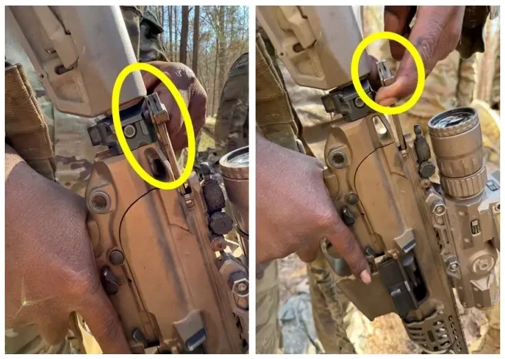 Чтобы взвести оружие, надо проделать ту же манипуляцию, что и на М-16/М4. Рукоятка затвора на тыльной части ствольной коробки отводится до упора назад. Просто и понятно, привычно всем солдатам… Но нет. Если отводить её до конца, она упирается в приклад. Так что в конце рукоятку надо тянуть ещё и вверх, а не только назад. Вроде мелочь, но странная, учитывая, что 100% американских солдат на системе Стоунера с таким недоразумением не сталкивались, а переучиваться будет как раз с неё. На XM7 есть ещё и дублирующая рукоятка взведения. Она расположена на левой стороне ствольной коробки. Но Трент утверждает, что военнослужащим неудобно ей пользоваться, расположена она высоковато, да и к другому они приучены, читаем выше. Видимо, это какой-то привет от спортивных манипуляций с оружием и соответствующей эргономики, который солдаты не оценили.