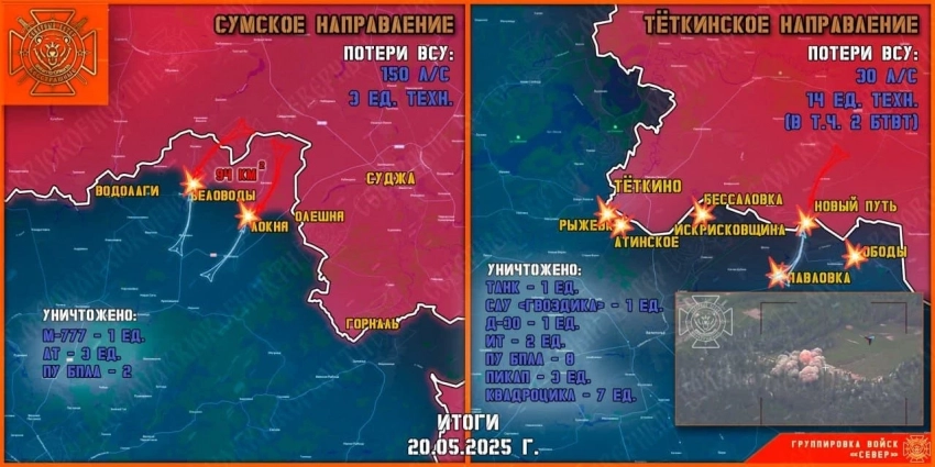ВСУ осуществили попытку прорыва в Тёткино в Курской области: карта боевых действий по состоянию на 22.05.2025