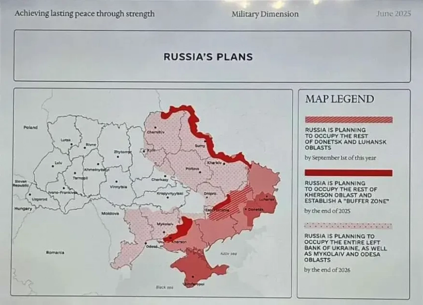 Как уже сообщало «Военное обозрение», замглавы офиса Зеленского по фамилии Палиса, представил карту с титрами на английском языке, где «цветными фломастерами» пометил «планы России по продолжению боевых действий». По утверждению Палисы, Россия «к концу 2026 года собирается захватить» всю левобережную Украину, а заодно Николаевскую и Одесскую области, плюс Киев.
