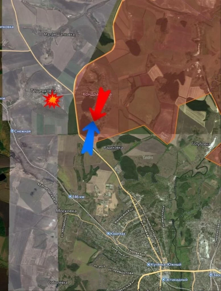 Одновременно поступают данные о прорыве оборонительной линии на Сумском направлении, где, по информации русских военкоров, крымские десантники штурмом заняли село Садки. По мнению авторов Telegram-канала "Образ будущего", в Сумской области все идет не только к созданию буферной зоны.