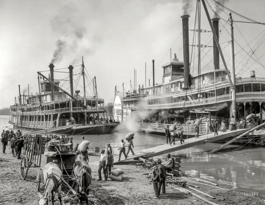Пароходы на Миссисипи под погрузкой. А это уже не картина а фотография того времени…