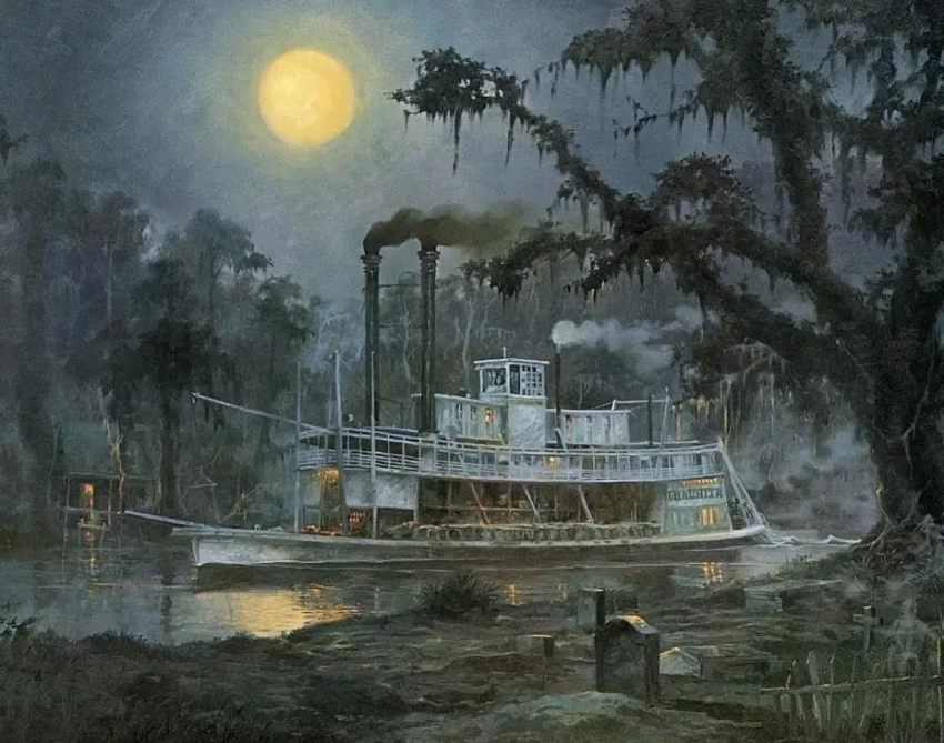 По каким только узким притокам Миссисипи не приходилось пробираться «пароходам Тома Сойера». «Пароход «Куахита» ночью». Картина Роберта М. Раклера.