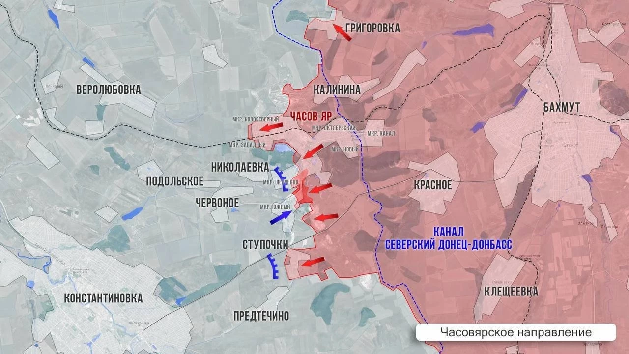 В районе Часова Яра идут ожесточённые бои как в самом городе, так и на его флангах. Российские войска ведут штурм, постепенно вытесняя украинские подразделения с занятых рубежей. ВСУ пытаются укреплять оборону, перебрасывая дополнительные силы на это направление.