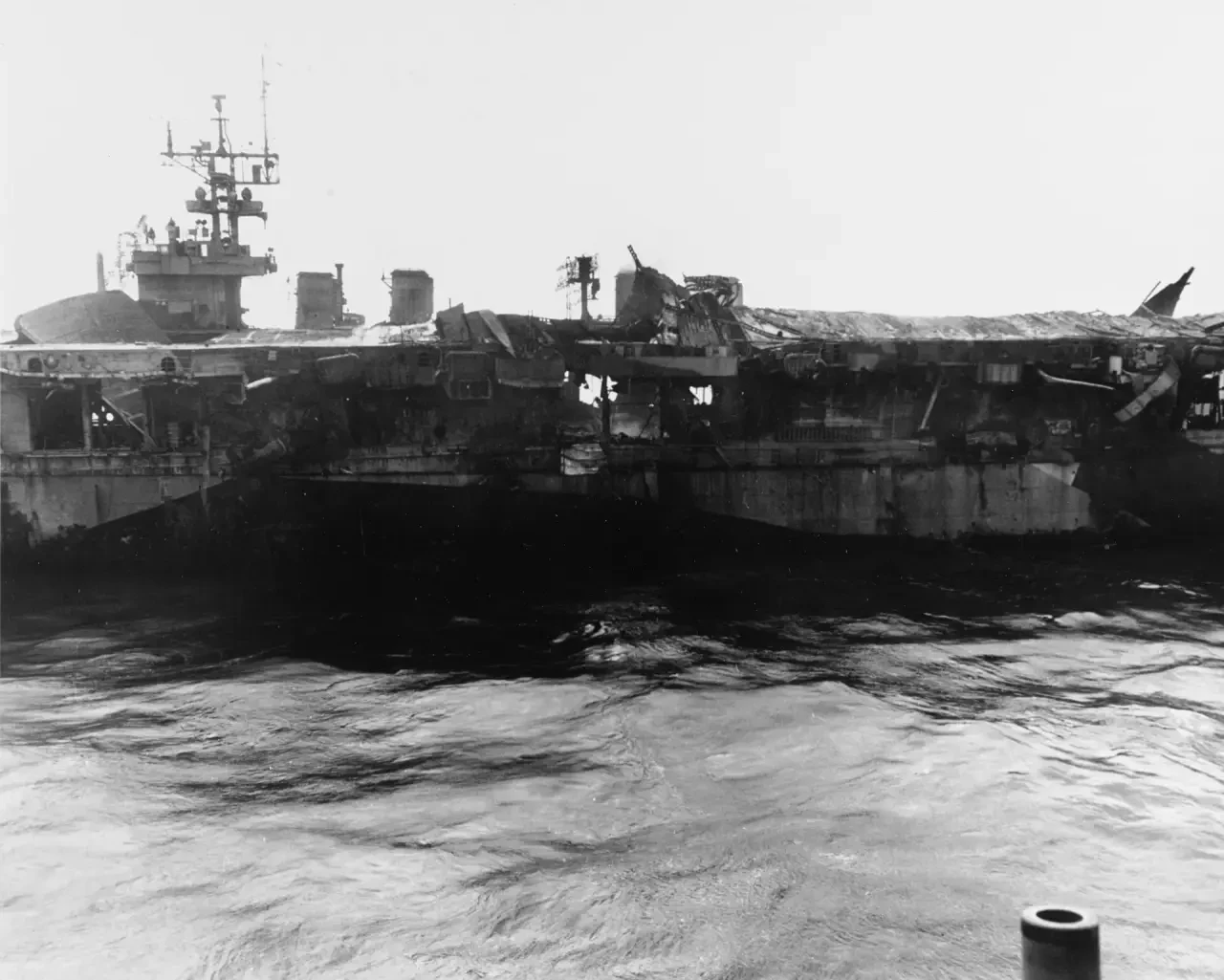 Авианосец «Yorktown» в бою у о. Мидуэй (4 июня 1942 г.) получил повреждения от попадания трех авиабомб и не менее двух торпед. Авианосец накренился и потерял ход, но остался на плаву. Только через двое суток после этого он был торпедирован японской лодкой и затонул.