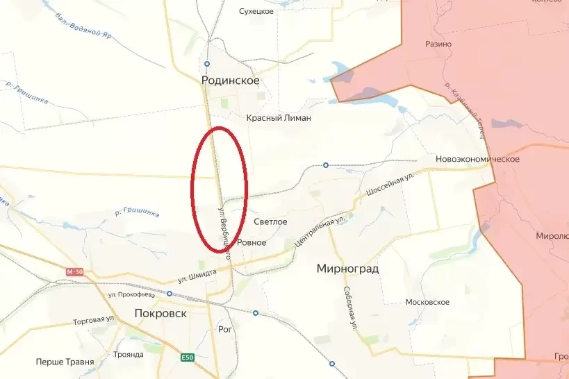 Обустроенный ВСУ коридор с защитой от дронов на автомагистрали от населённого пункта Родинское до Красноармейска (украинское название Покровск) сильно повреждён, его восстановление или ремонт в настоящее время невозможно, поскольку линия фронта уже проходит на небольшом расстоянии от этой дороги.