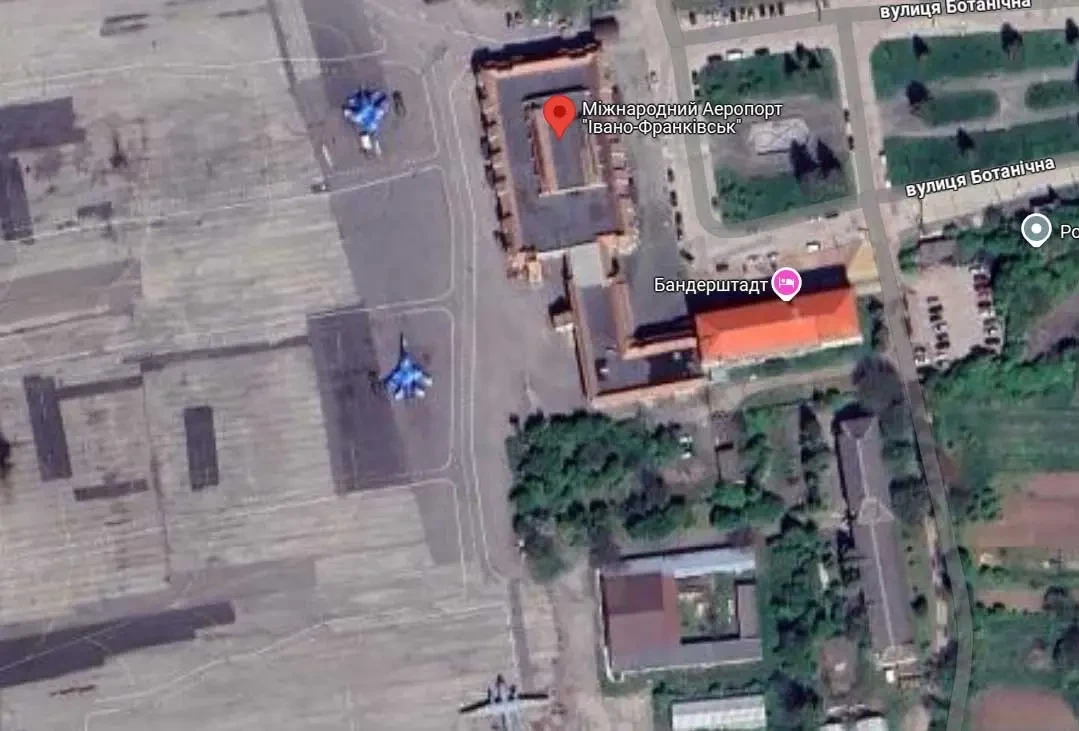 Дело в том, что одна из целей для ударов российскими ракетами – международный аэропорт Ивано-Франковска. Как показывают карты «Гугл» за текущий год, на аэродроме ВС ВСУ размещали боевую авиацию. Самолёты ВС ВСУ находились на аэродроме и на момент пуска ракет.