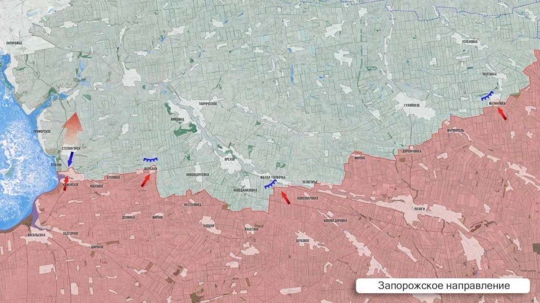 На Запорожском фронте наши десантники продолжают продвижение из Каменского на Плавни. Одновременно поступает информация про наступление в район Степногорска. Идут тяжёлые бои.