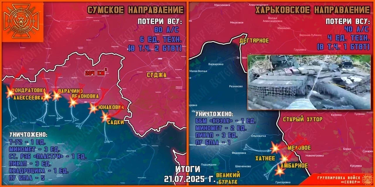 Самые ожесточенные бои - в Кондратовке. ВСУ пытаются вытеснить российские войска из западной части села. Также идут бои за дорогу на Храповщину и на юго-западной окраине Юнаковки. Российские войска расширяют позиции в районе Поповка-Демидовка, у Марьино.