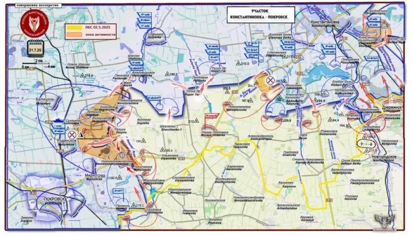 На Константиновском направлении продолжается наступление в районе Яблоновки и Александро-Калиново. Западнее наши продвинулись восточнее и северо-восточнее Попов Яра и штурмуют западную часть Полтавки.