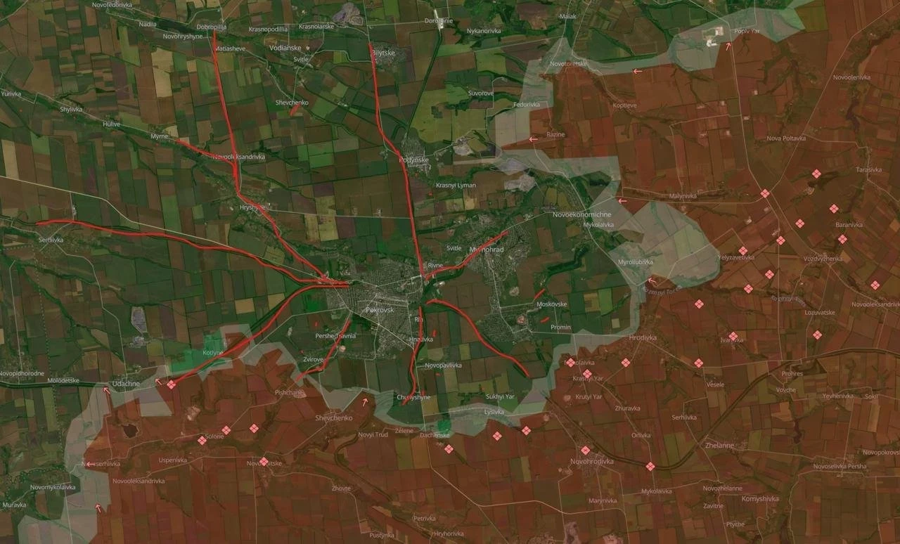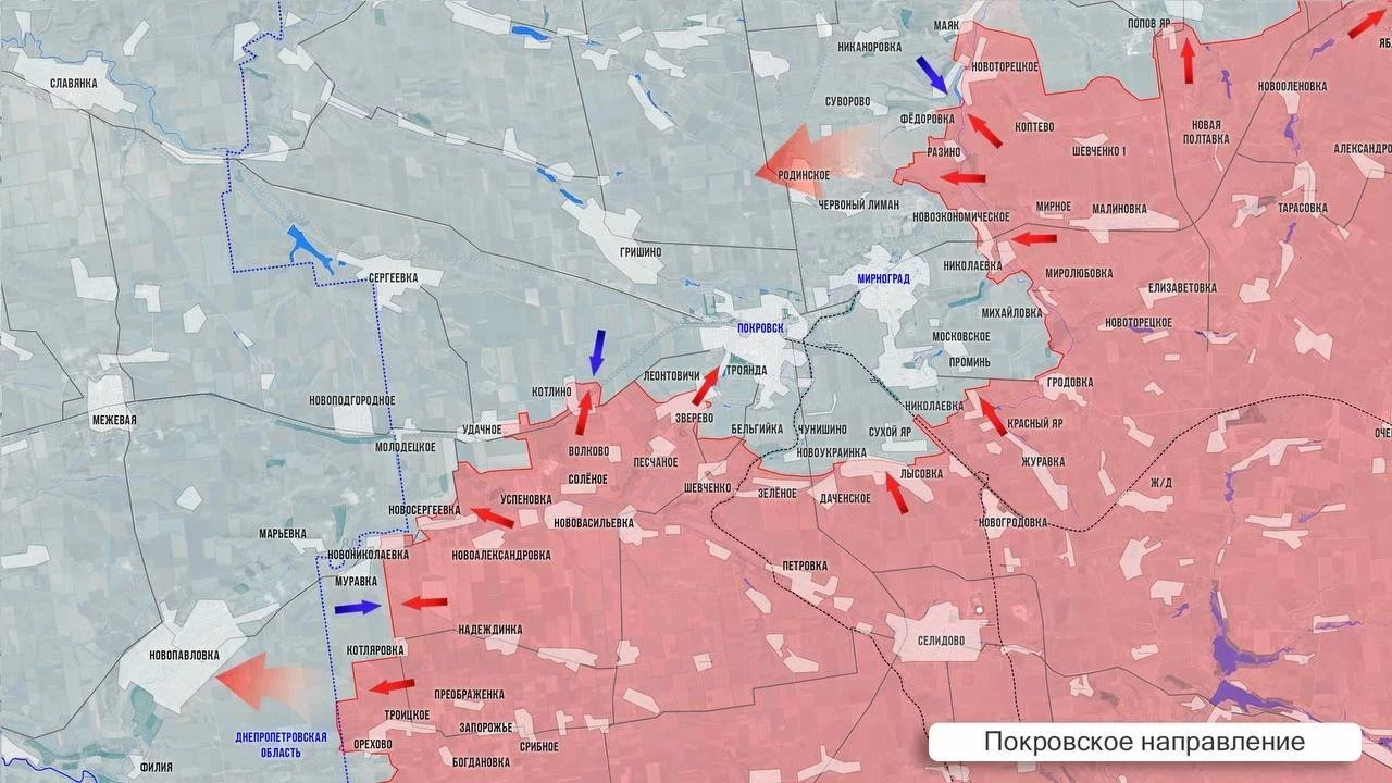 На Покровском фронте наши войска закрепились в «серой зоне» к югу от Орехово, что тоже у границы Днепропетровской обл. Основное внимание переключается на Покровск. По данным с мест, передовые отряды наших войск заходят в город с юго-запада, из освобожденного Зверево. Одновременно усиливается давление с северо-востока от Мирнорграда, в районе Родинского. Так формируются клещи для захвата агломерации. От ВСУ сообщают, что наши просачиваются малыми группами и накапливают силы для будущих ударов. По данным западных журналистов, Россия сосредоточила значительные силы вокруг Покровска - около 111 тысяч человек. По данным ряда источников, у ВСУ в городах и на флангах около 4 тыс пехотинцев. Как сообщают турки, под Покровском эвакуирован штаб ВСУ - признак того, что город скоро будет потерян.