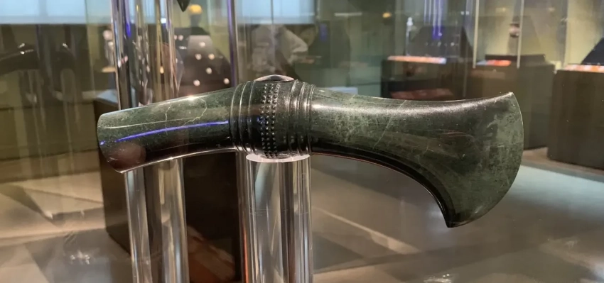 Впрочем, история — историей, но сейчас мы с вами посмотрим на экспонаты Пушкинского музея, вызвавшие именно мой интерес и определенным образом связанные с тематикой сайта. Вот, например, этот топор-молот ритуального предназначения. В пояснении написано: «Нефритоид(?), жадеитит(?), лазурит; позолота». А также вот еще что: «Ритуальные топоры-молоты были широко распространены в Европе и на Кавказе с эпохи ранней бронзы по конец II тыс. до н.э.».