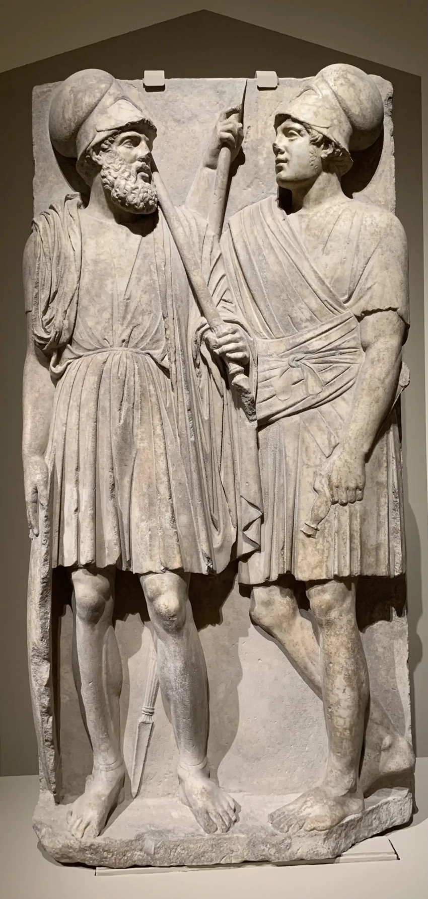 Стела с двумя воинами в шлемах. Найдена на Таманском полуострове. Оригинал. Третья четверть IV в. до н.э.