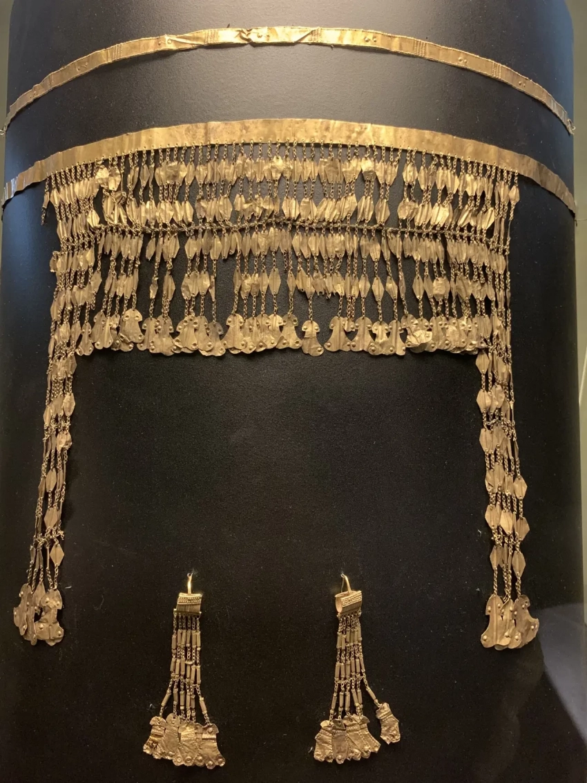 Еще одна впечатляющая диадема с подвесками в форме «идолов» (диадема большая), золото. Существует гипотеза, что троянские диадемы могли служить для украшения культовых фигур в мегаронах. Довольно значительная высота центральной части диадем предполагает, что они могли монтироваться на головном уборе из ткани или на прическе. Спрашиваю сотрудницу в зале: «Почему так мало экспонатов из «клада» выставлено и… ведь это же явно гальванокопии, уж очень «золото» на них «желтое». А она мне: «Это чистое золото! Зачем копию-то делать? А неполный клад потому, что его разделили. Часть предметов ушла в «золотую комнату» Эрмитажа». «А почему?» «Потому что…» «Но разве не опасно хранить такую ценность вот так… просто?!» «Просто? Стекло пуленепробиваемое, кругом датчики и камеры. Так что не беспокойтесь!» «И вот так с того времени и хранится?» «Да, так и хранится!» «А закон о реституции?» «Пусть «янтарную комнату» отдадут, тогда и говорить будем»… Словом, очень интересно пообщались. Кстати, серьги, найденные вместе с диадемой, достаточно редки, однако известны и в кладах Троады, и Центральной Анатолии. То есть это совершенно местное украшение!