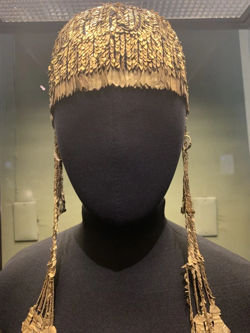Мне всегда была очень интересна история Трои и знаменитого «клада Приама». И вот предметы из этого клада прямо перед глазами. Диадема, украшенная пуансонным орнаментом; отверстия на концах ленты использовались для продевания шнурка, которым диадема завязывалась на затылке. Подобные узкие и орнаментированные ленты-диадемы известны как в Трое, так и на памятниках Эгейского бассейна и Анатолии.