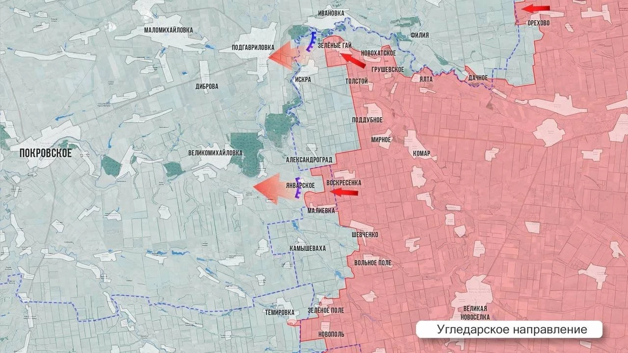 На западном участке Покровского направления армия России атакует вдоль лесополос в направлении границы с Днепропетровской обл. На юге от Покровска российская пехота, несмотря на ожесточённое сопротивление ВСУ, продвинулась далеко за Троянду и ведёт бои в районе Шахтёрского, чтобы выровнять линию фронта и выйти на железнодорожную ветку. Противник отступает из соседнего Чунишино. Вооружённые силы России отрезали восточный путь снабжения Покровска, продвигаясь в районе Миролюбовки. Наступая в районе Сухецкого, что на севере от Родинского, наши войска лишили противника и важнейшего северного маршрута снабжения Покровска. При этом потеря самого Родинского ускорит обрушение всего северного участка обороны Красноармейской агломерации.