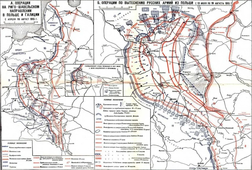 «Поэтому мы имеем возможность сейчас выбрать, — отмечал генерал, — что для русской Ставки предпочтительнее: попытка удержать Польшу — с вероятной перспективой катастрофы для армии или же попытка сохранить армию — с неизбежным в этом случае выводом всех наших войск из Царства Польского».